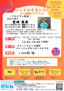 全 29 件 [ 1 ~ 20 件目 ] « < 1 2 > » 55歳以上限定!GOGO!!キャンペーン グリーンアリーナ神戸トレーニングセンターを初めてご利用の55歳以上の方へ、様々な特典付きのお得なキャンペーンを実施します! 秋からスタート!安心・お得にジムデビュー! SUMA×YOGA 須磨離宮公園ガーデンヨガ 須磨離宮公園の綺麗な紅葉と芝生が広がる静かな庭園でのヨガで、ココロもカラダもリラックス♪ 日々の喧騒から離れ、自分へのご褒美を贈ってあげませんか? 噴水広場に約1,000本のキャンドルによるアート作品が登場する『クリスマスキャンドルナイト』が同日開催! 10/26(日)おそとであそぼう!【雨天の場合は11/1(土)に延期となります】 神戸総合運動公園コスモスの丘上広場にてイベントを開催!! 親子で楽しめる体操や楽しいゲームが盛りだくさん!! いつもとちがう野外で思いっきりかけまわっちゃおう!! グリーンアリーナ神戸トレーニングセンター初回利用のご案内 初めてグリーンアリーナ神戸トレーニングセンターをご利用になる方は、「はじめてサポート」の受講と登録が必要です。 トレーニングジムや施設の利用方法、マシンの使用方法など、スタッフが丁寧に説明させていただきますので、「初めてトレーニングジムを利用する」、「ひとりで不安」という方もご安心ください♪ KAYAメソッドストレッチ【要予約】 ★プログラムの特徴・目的★ ・カラダが変わると人生が変わる ・普段使わない内層筋 ・疲れにくいカラダづくり ・背骨に隙間を作り体調を整える ・ニュートラルな姿勢づくり ・カラダを緩めて緊張からの解放 第5回 須磨離宮公園 モルック大会 フィンランド生まれの、誰でも楽しめるユニバーサルスポーツ『モルック』! 小学生からご参加いただける大会です!会場は須磨離宮公園内 花の広場で開催! 予選ラウンドで3試合に参加!上位8チームはファイナルラウンドへすすめ、優勝チームには賞品贈呈します☆★さぁ、チームをつくってモルックを楽しみましょう! ノルディックウォーキング~須磨離宮公園 秋のバラ園をめざそう!~ 秋の心地よい風を感じる季節。 海、山、寺と魅力ある自然豊かな須磨のまちをノルディックウォーキングで爽快に歩きましょう! 須磨離宮公園では、この時期にしか見られない「秋バラ」を楽しめますよ。 「神戸女子大学歴史ウォーク2025」も開催中!(任意参加) お昼ごはんは 「ガーデンパタジェ」のランチボックスをご用意します。 ジャイロキネシス® 少人数制プログラム カラダを鍛える運動ではなく、筋肉を引き伸ばして関節にスペースをつくることで、姿勢改善、体のコリの改善、緊張からの解放へと導きます。 まずは現状を認識し、目標を立て、楽しみながら自分探しの旅に出かけましょう! みんなの体力測定@ジム 【参加無料】予約不要 ★参加者限定特典あり★ 未来につながる健康・体力づくり「みんなの体力測定@ジム」を開催! 参加無料!事前予約不要!どなたでもご参加いただけます! いつまでも元気に動ける体づくりの第一歩! 体力測定で現状の体力・カラダ年齢を確認してみませんか? SUMAビーチモルック大会2025 須磨海岸(神戸市須磨区)を会場に、SUMAビーチモルック大会を開催! 同会場にて、「Suma豊かな海フェスタ2025」も同日開催され、ミニライブなどのステージや体験ブース、須磨の海を知る展示ブースなど、イベント盛りだくさん! 地元の農家さんやお店が出店する「EAT LOCAL KOBE ファーマーズマーケット」も開催されます! はじめよう!!フットサル(初心者向けフットサルクリニック) はじめよう!!フットサルは、パスやドリブルなど基礎練習を中心とした、初心者の方を対象としたフットサルクリニックで、通称『はじサル』! 現役フットサル、サッカープレイヤーのコーチが、楽しく愉快にフットサルの魅力を伝えます! 神戸でモルック!カップ フィンランド発祥!近年話題のニュースポーツ『モルック』!神戸総合運動公園の 広々としたグラウンドでの大会 「神戸でモルック!カップ」を開催!上位で賞品GET!小学生からご参加いただけます。 グリーンアリーナ神戸スタッフ(パート・アルバイト)を募集中! 神戸総合運動公園グリーンアリーナ神戸(体育館)やトレーニングセンターで働いていただける、パート・アルバイトスタッフを大募集! 現在、主婦・学生の方が活躍中です!ダブルワークも可!未経験者も歓迎!経験者は大歓迎! 大人のための卓球教室 秋期クラス (9月~12月)会員募集中! 初心者から経験者まで、1人1人のスキルに合わせて、上級指導員の講師が丁寧に指導します! ユニバーウォーキングクラブ in 神戸総合運動公園 神戸総合運動公園内を中心に活動する、ウォーキングクラブです! 毎月色々なテーマの講習会を開催しており、園内の四季や植物も楽しみながら歩きましょう! 親子向け教室情報 年代別に教室を開講しています♪ 親子体操教室の内容やおすすめポイントをご紹介します☆ 各教室・幼児向けイベントのお申し込みもこちらから★ ベビーマッサージ教室 誕生後すぐにタッチケ